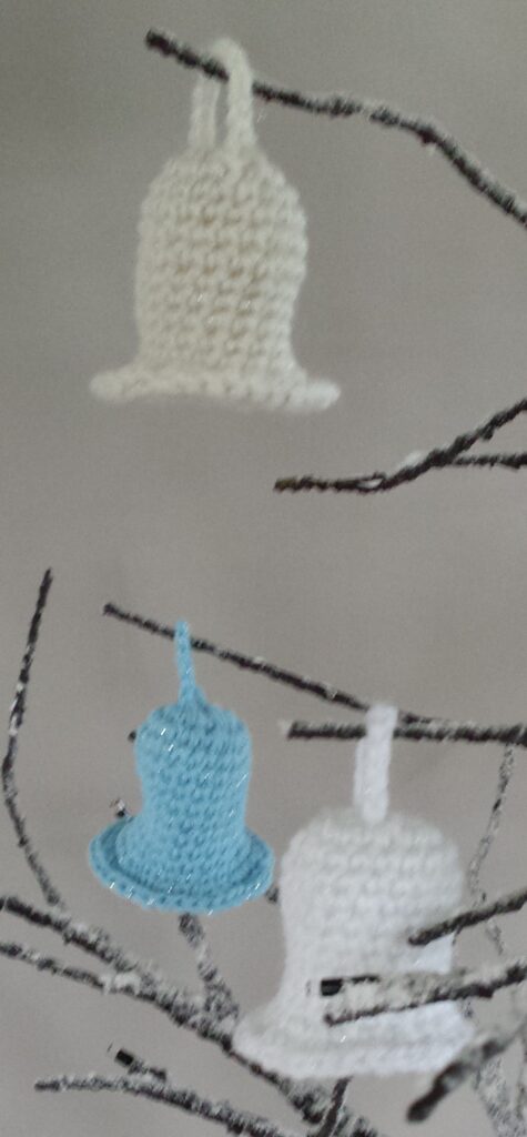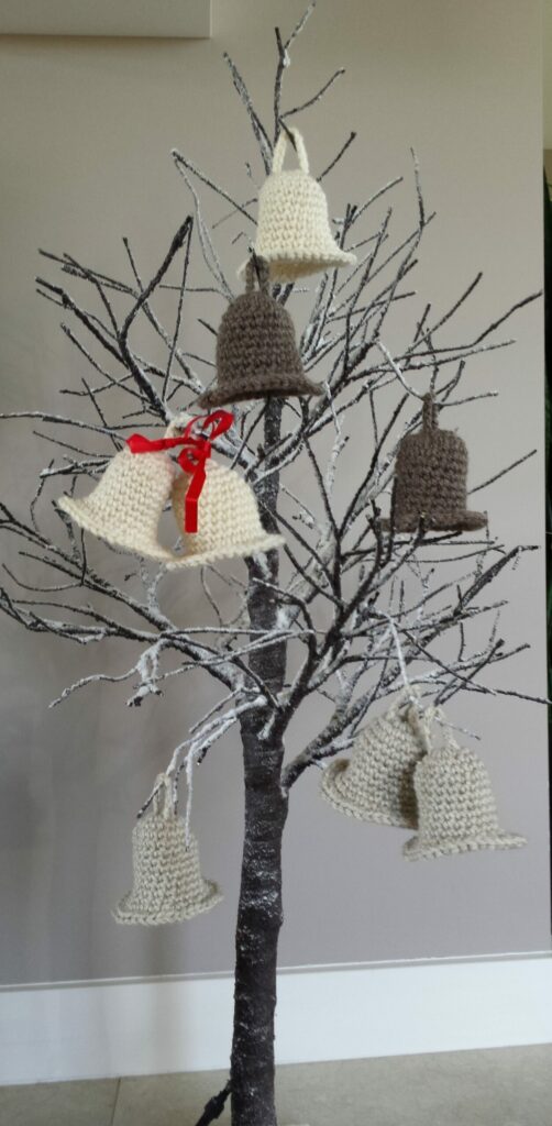 Bij ‘stijlenzo’ zag ik gehaakte kersklokjes. Het is een eenvoudig patroon en je kan ze maken van allerlei soorten wol/katoen. Zelf vind ik de kerstklokjes gehaakt van extra dikke wol het mooist. Je kan ze apart in de boom hangen maar een duo-tje met een lintje eraan staat ook leuk.