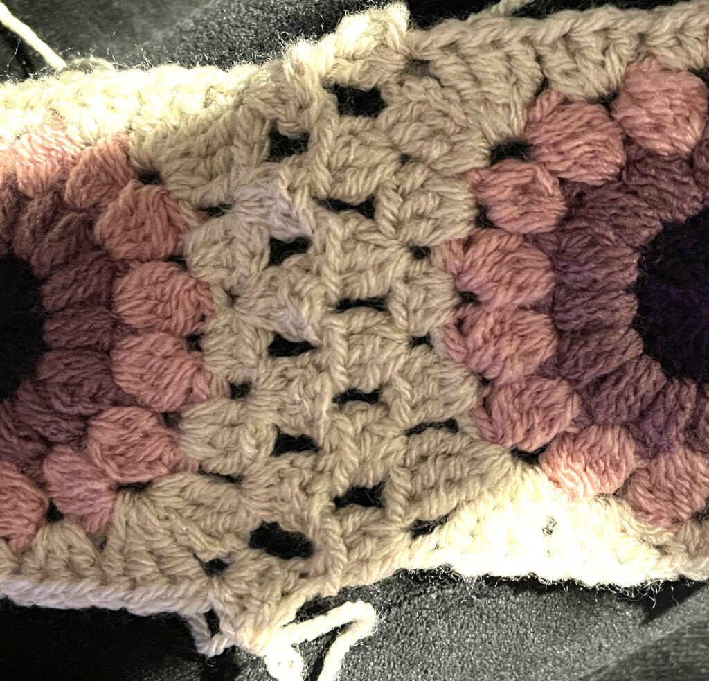 Je kan op meerdere manieren de grannies aan elkaar vastmaken. Hakend of met naald en draad. Wij hebben voor haken gekozen. Ook dit kan weer op meerdere manieren. In eerste instantie hebben we telkens 3 stokjes aan de ene granny gehaakt en dan weer aan de andere. Als je dit voortzet, dus om en om 3 stokjes, dan krijg je een extra rand en dus extra breedte/lengte (zie foto 1).
