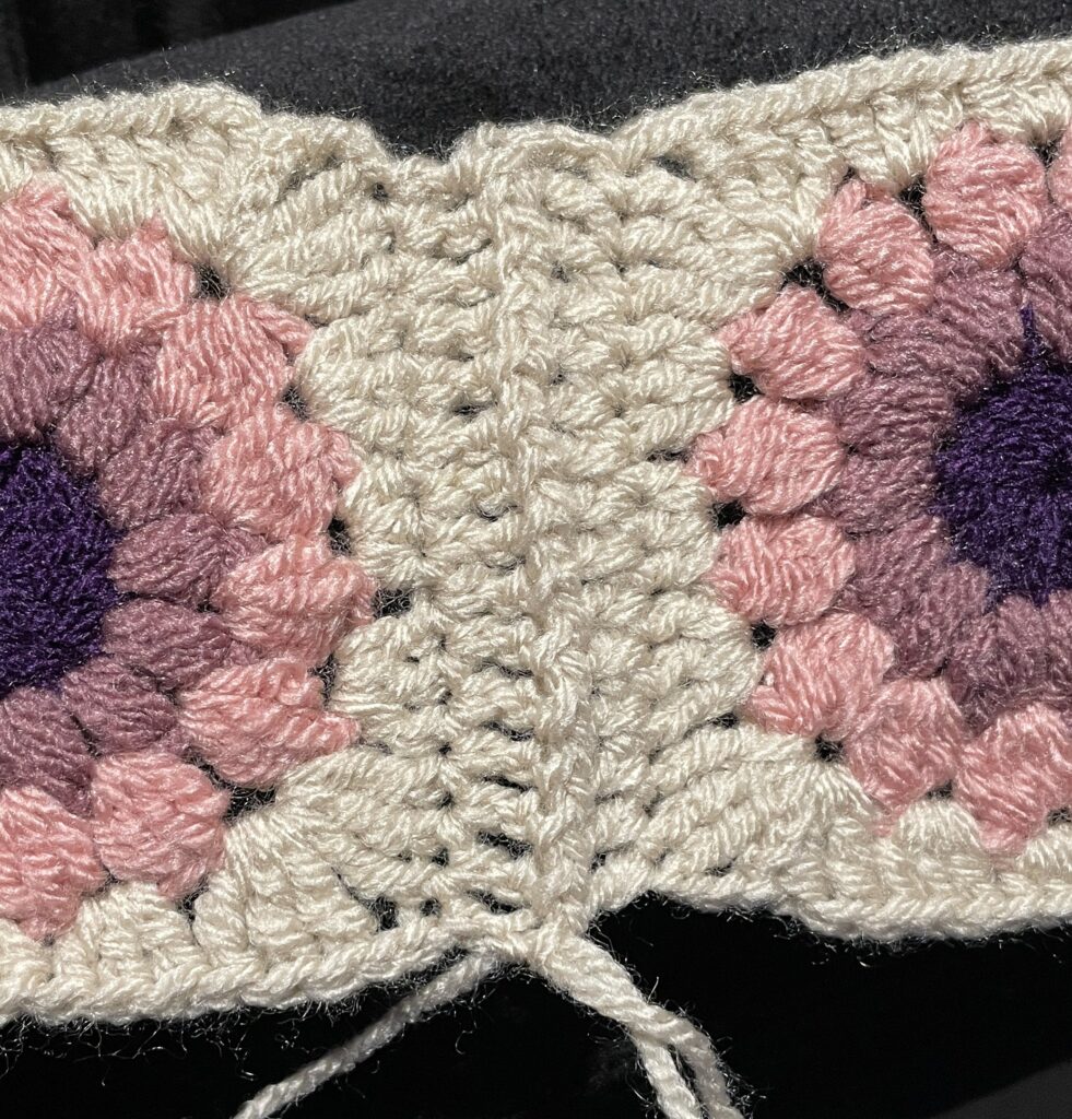 De tweede optie was om en om 1 stokje (foto 2). Allebei deze manieren maakten ons niet enthousiast dus is het optie 3 geworden: grannies aan de achterkant samenhaken door in iedere steek van allebei de grannies een vaste te haken. Bewust gekozen om dit aan de achterkant te doen zodat de ‘dikke rand’ aan de voorkant niet zichtbaar is. Het gevolg van deze manier is wel dat de grannies nog ietsje kleiner worden. 5 aan elkaar gehaakte grannies hebben nu een afmeting van 46 cm.