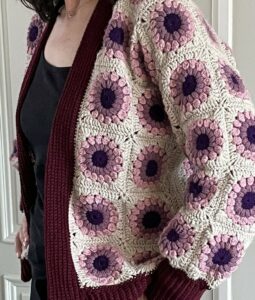 Eerst zijn we op zoek gegaan naar een ‘voorbeeldvest’. Deze vonden we bij Het Wolplein. Het model was precies wat we zochten. Wel hebben we er een langer vest van gemaakt. De grannies zelf hebben we van ‘Hooked By Robin‘. Deze sunflowergranny is door haar duidelijk uitgelegd in een youtube-filmpje. Zelf vind ik filmpjes minder fijn dus heb het het patroon van de granny hieronder beschreven.