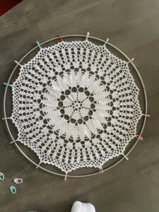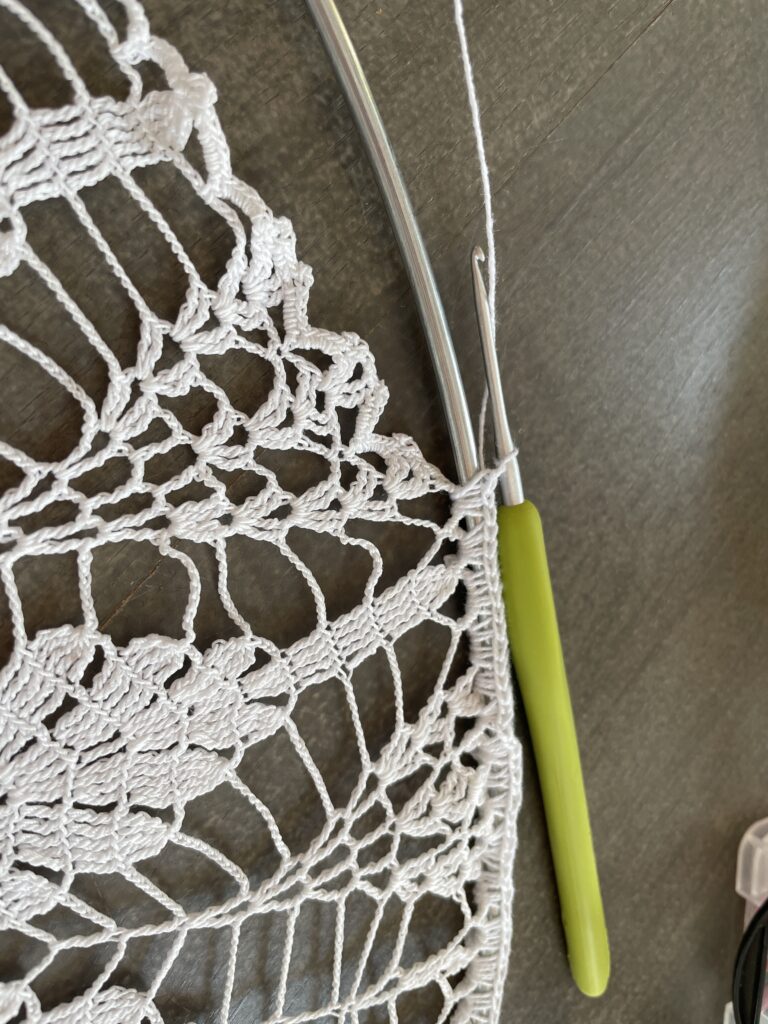 Hou je niet van haken? Of misschien kan je niet haken? Met naald en draad krijg je het ook voor mekaar om het kleedje vast te maken in de ring. Als ik ‘mijn voorbeeldafbeelding’ bekijk zijn al die mandala’s ook met dunne draadjes bevestigd aan de (witte) ringen.