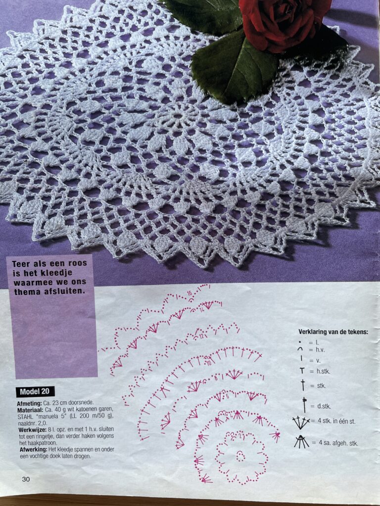 Nadat ik heel veel oude haakboekjes had doorgespit had ik eindelijk m’n keuze gemaakt voor dit haakpatroon van ‘Sabrina-kreatief’ editie ‘kantachtige kleedjes’. Dit boekje dateert nog uit de ‘guldens-tijd’ en er is zelfs nog geen emailadres of website in te vinden. Wél is er ’telefoonservice’ :-). Ik schat dat het boekje rond 1995 is uitgebracht. Wie wat bewaart…..