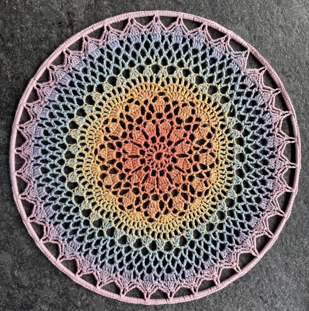 Zelf een kleedje haken en vervolgens spannen in een ring om een unieke mandala te maken. Al meerdere keren zijn er ‘gehaakte kleedjes in ring‘ voorbij gekomen bij Mandia maar deze heeft weer een apart verhaal gekregen omdat het patroon niet compleet was.