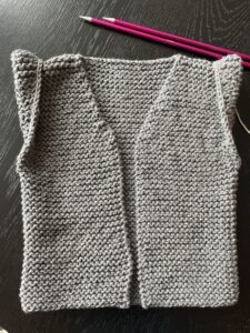 Nu het vest klaar is zie ik dat grijs niet echt mijn kleur is. Daarom ben ik het gilet nu aan het breien in een andere kleur. Dit gilet heb ik aan Anita gegeven, hopelijk heeft zij hier veel plezier van, het staat in ieder geval mooi bij het lila truitje. Zoals je ziet op onderstaande 3e foto kan je het gilet aan 2 kanten dragen. Draag je het rechts? Dan vallen de kapschouders extra op. Het is maar net wat jij mooi vindt….